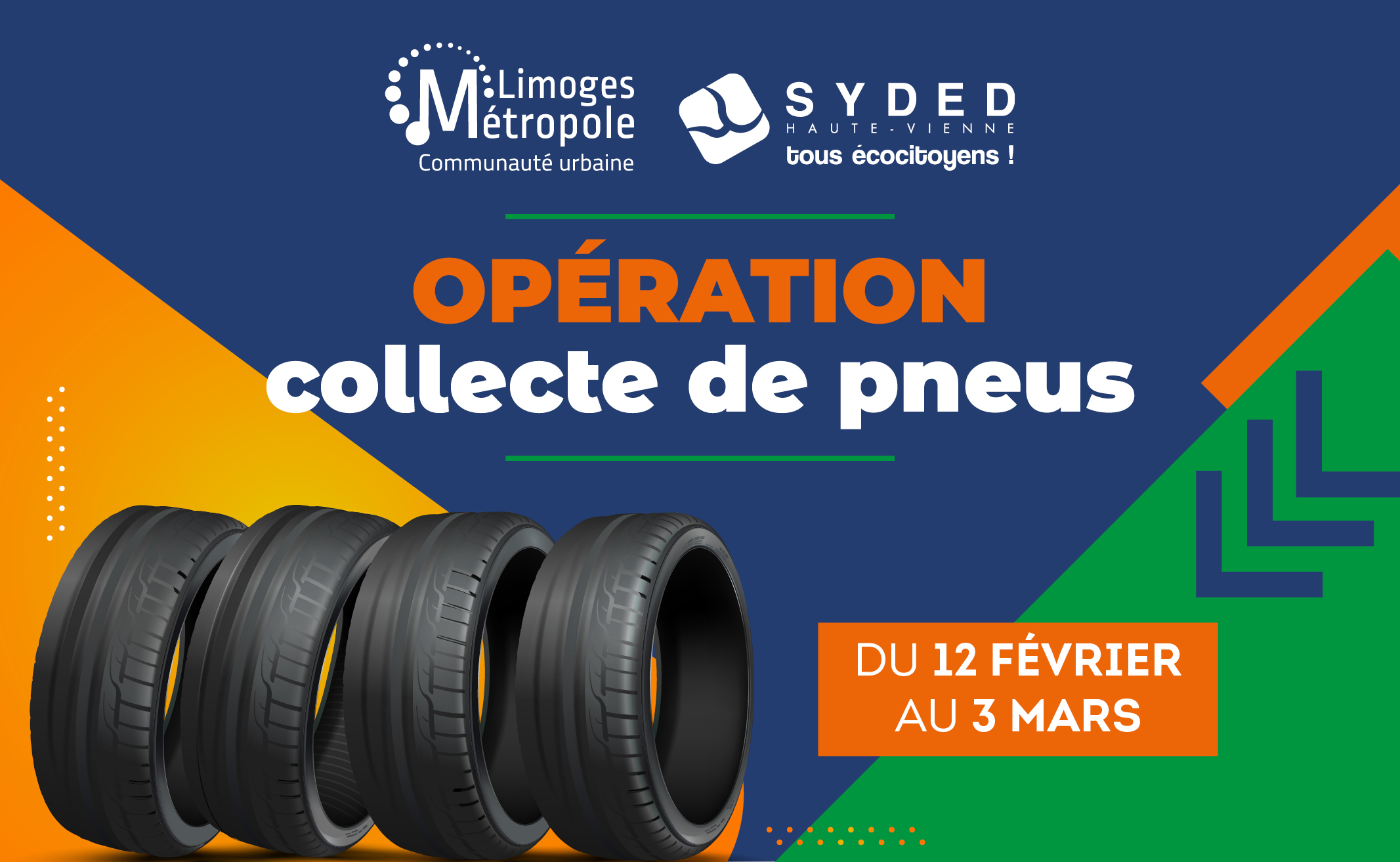 le SYDED organise une collecte exceptionnelle de pneus à destination des particuliers, du 12 février au 3 mars 2024 sur les déchèteries d’Ambazac, Bosmie l’Aiguille, Châlus, Eymoutiers, Magnac Laval, Nexon, Saint-Bonnet-de-Bellac, Saint-Germain-les-Belles, Saint-Junien, Saint-Léonard-de-Noblat, Saint-Yrieix.